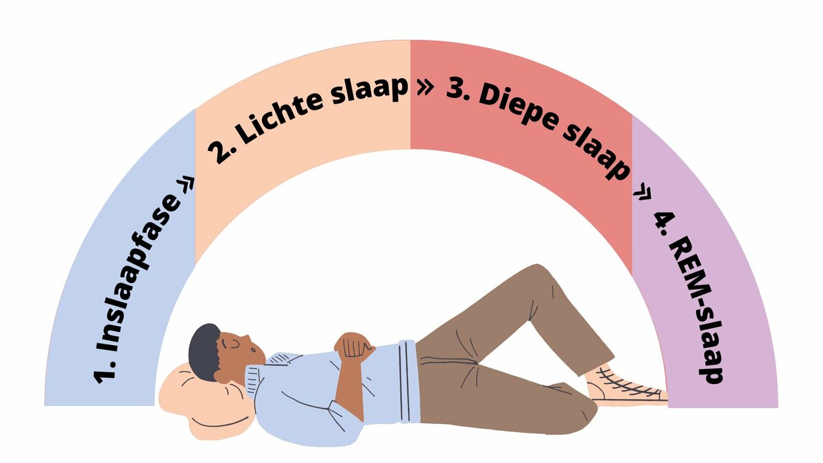 Tijdens je slaap doorloop je verschillende fasen. Een volledige slaapcyclus duurt zo’n 1,5 tot 2 uur en je doorloopt deze gemiddeld vier tot vijf keer per nacht.